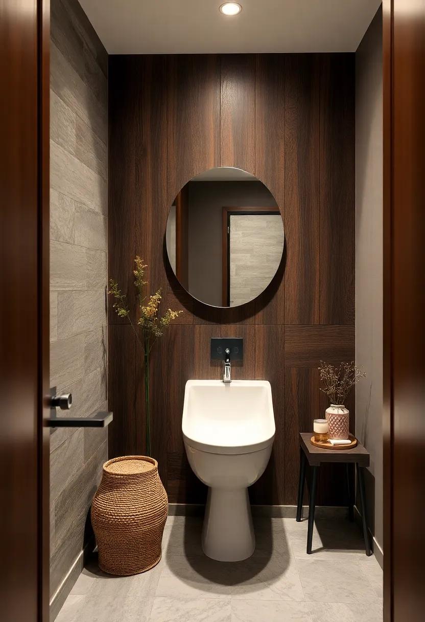 Dark Wood Accent Walls Enhance Powder Rooms With Handcrafted Art Pieces and Sculptural Elements