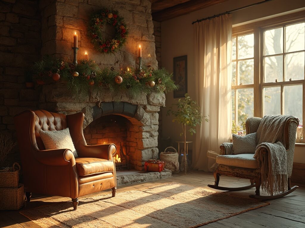 Vintage-style living room bathed in golden hour sunlight featuring a leather armchair by the stone fireplace adorned with orange garlands and brass candlesticks, rocking chair covered with cream throws, mantel decorated with pine branches and baubles, backdrop of west-facing windows.