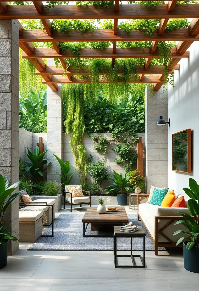 The Elegant Interplay Between Vertical Garden Walls and a Pergola's Open-Air Canopy