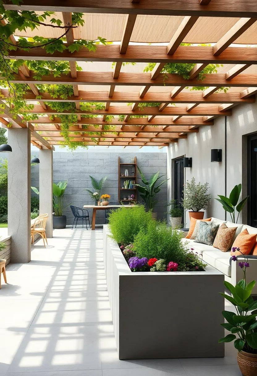 A Modern Pergola with Integrated Planters Overflowing with Herbs and Edible Flowers in an Urban Garden