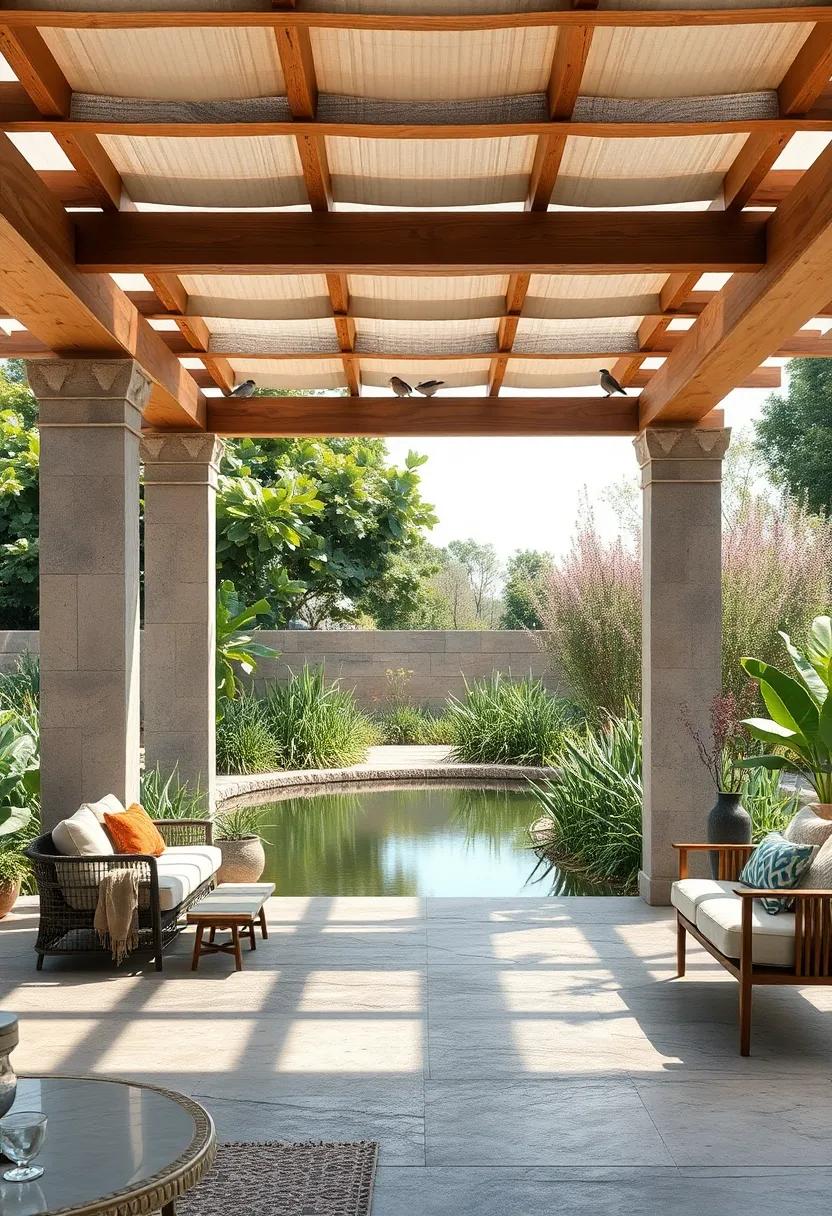 • Natural textures: Use rough-hewn wood for pergola beams to blend organically with the landscape.