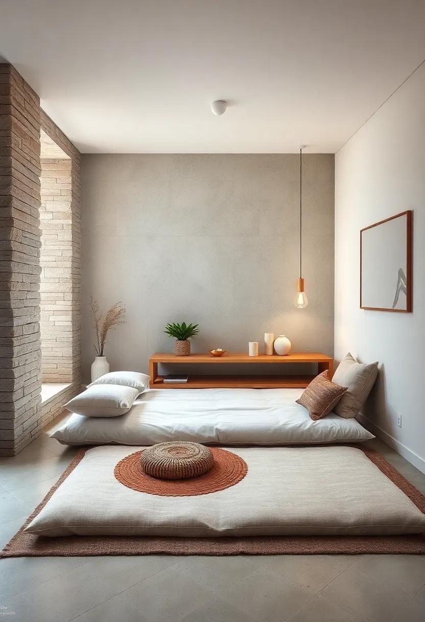 A Cozy Meditation Corner Featuring a Floor Mattress with Minimalist Cushions and Soft Rugs