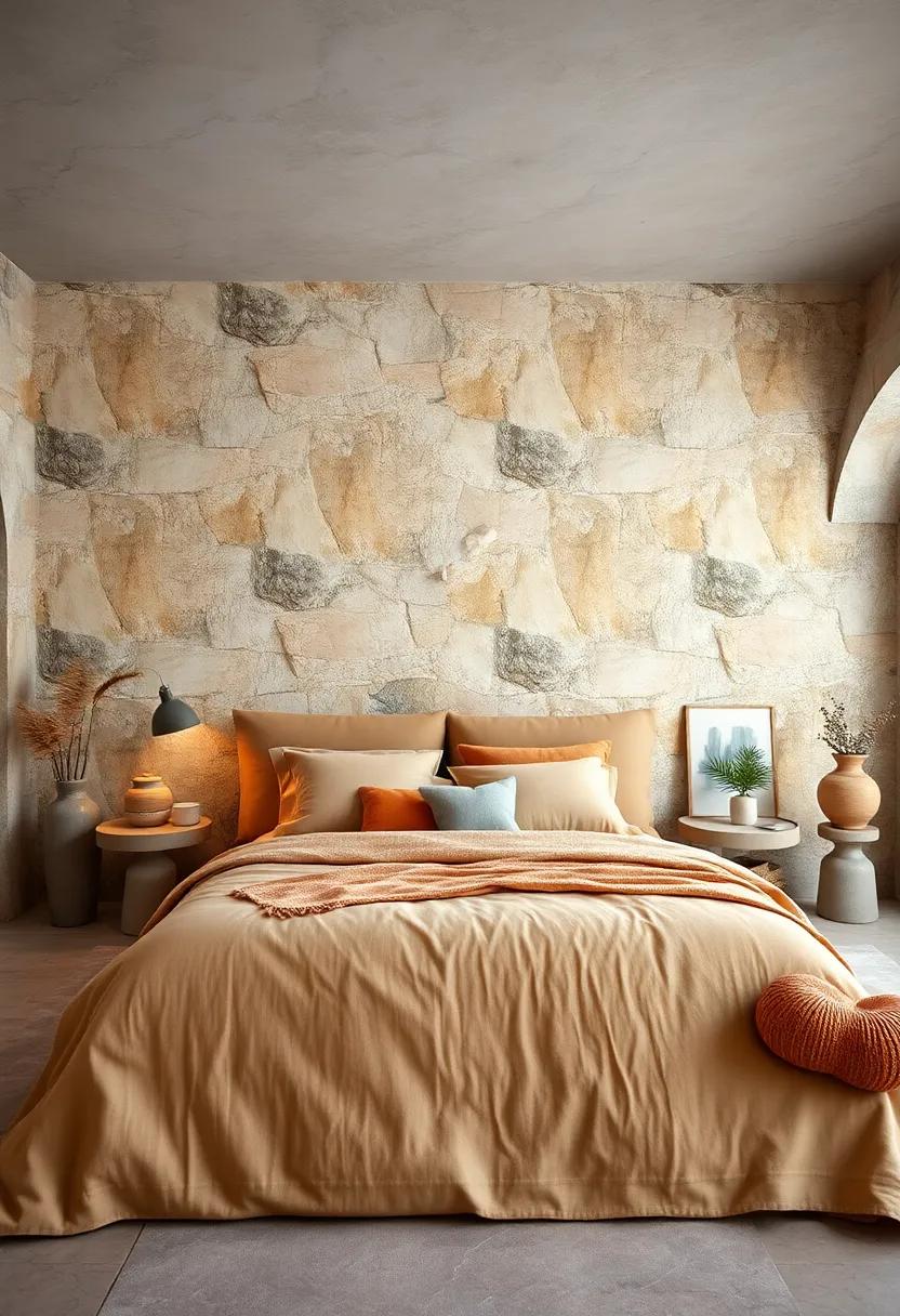 Grainy Stone Surfaces Enhanced by Subtle Natural Cracks and Earthy Hued Bedding For Rustic Bedroom Appeal