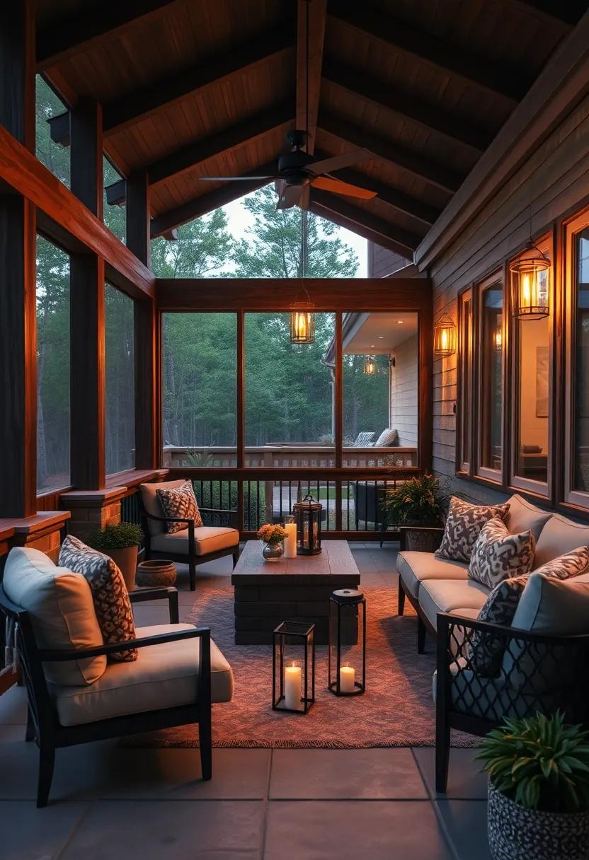Rustic Modern Screened Porch Blending Raw Wood Elements, Soft Upholstery, and Ambient Lantern Glow at Twilight