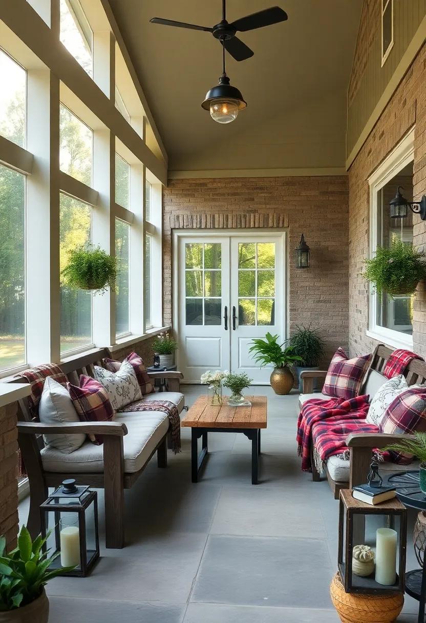 Sun-Drenched Farmhouse Screened Porch with Reclaimed Wood Benches, Plaid Throws, and Mason Jar Lights