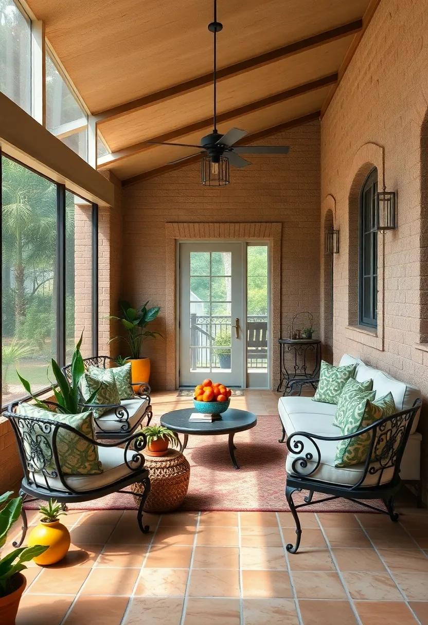 Sunny Mediterranean Screened Porch with Terracotta Tiles, Ironwork Furniture, and Colorful Ceramic Accents