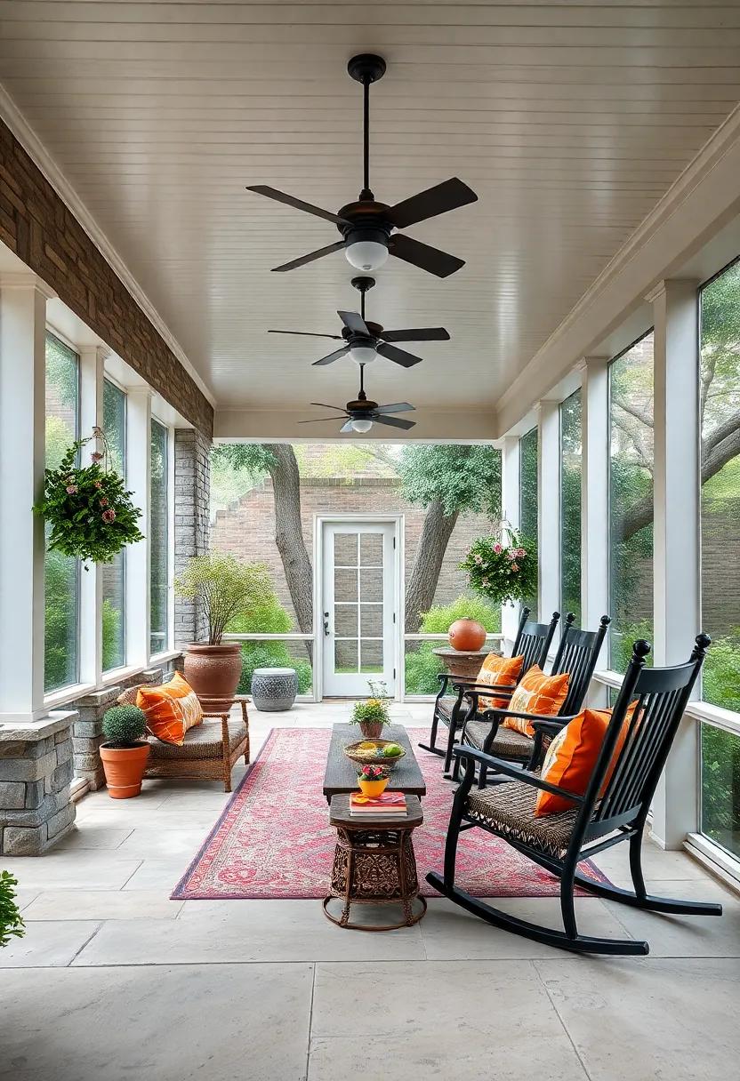 Traditional Southern Screened Porch with Ceiling Fans, Rocking Chairs, and Lush Garden Surroundings for Warm Nights