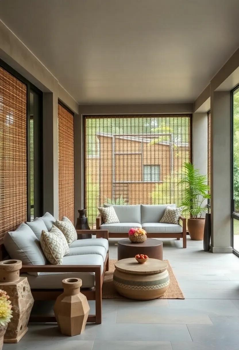 Zen-Inspired Screened Porch Featuring Bamboo Screens, Stone Lanterns, and Minimalist Seating Arranged in Harmony