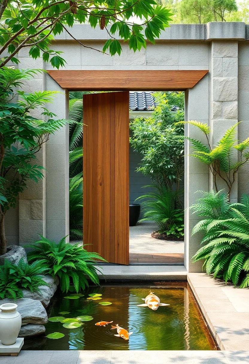 At the base, a gentle koi pond mirrors the sky and the rustling leaves above, its surface etched by tiny ripples that guide the eye along the path. The water’s serene movement complements the static strength of the wooden gate, bridging the realms of motion and stillness. Here, the sensory harmony of wood, water, and foliage unites to form an oasis of calm-perfect for reflection and slow, mindful breaths.