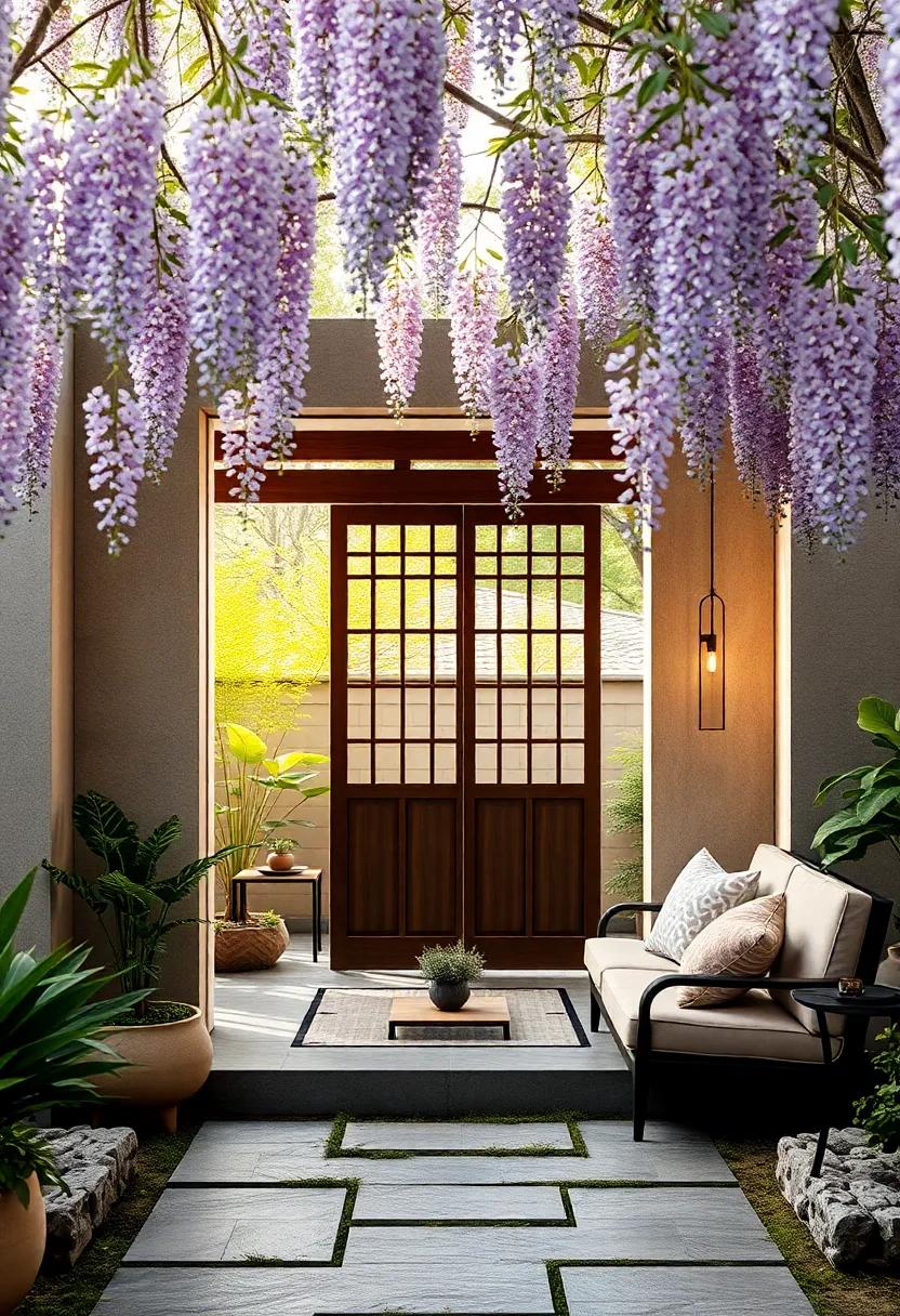 The seating nook itself is thoughtfully integrated with the gate’s framework, drawing inspiration from Japanese minimalism and biophilic principles. Materials such as weathered cedar and smooth river stones complement the organic allure of the wisteria’s twisting vines. To enhance comfort and ambiance, consider incorporating: