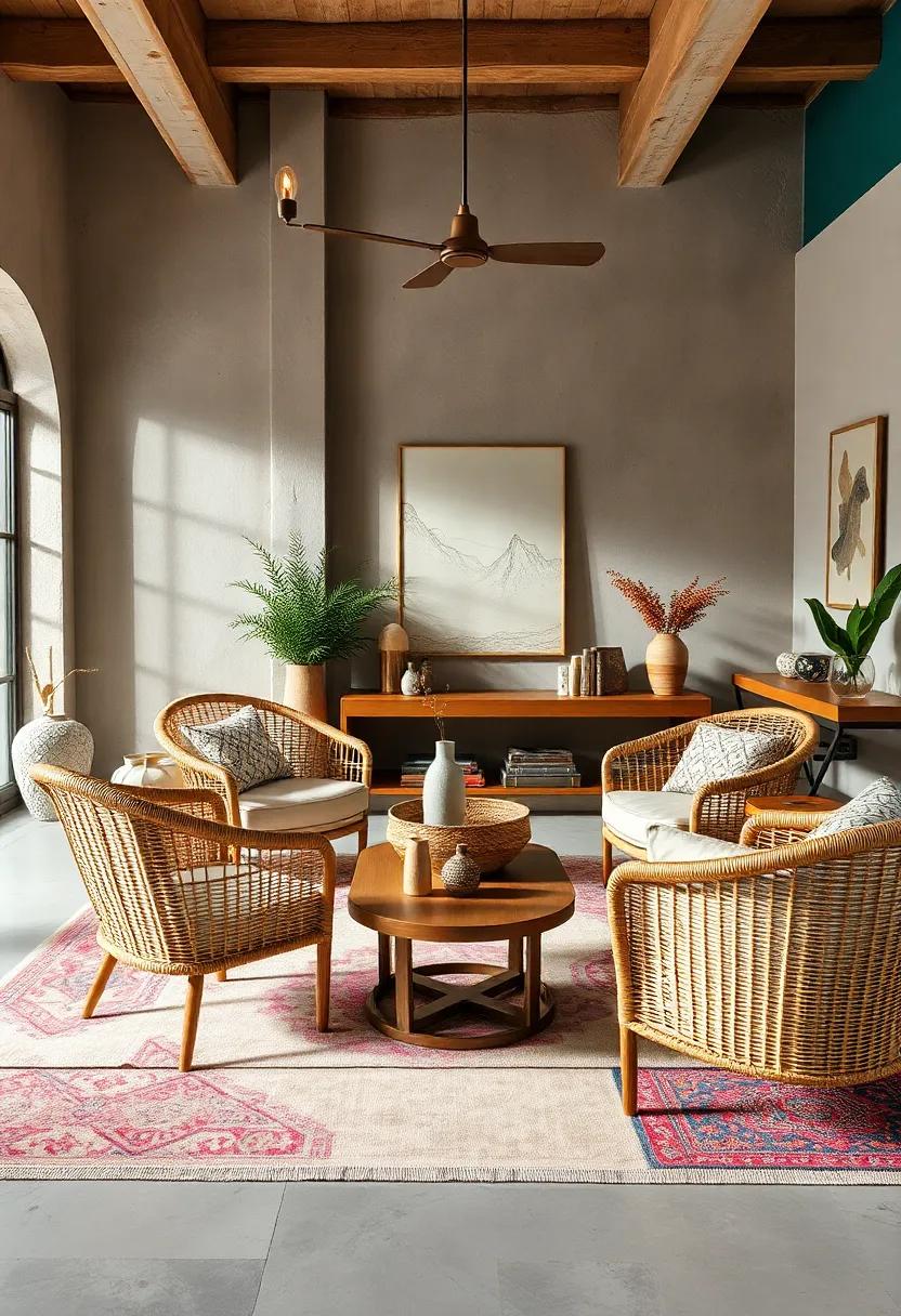 • Textural harmony: Combining smooth painted walls, rough cane textures, and lush rugs creates balanced tactile energy.