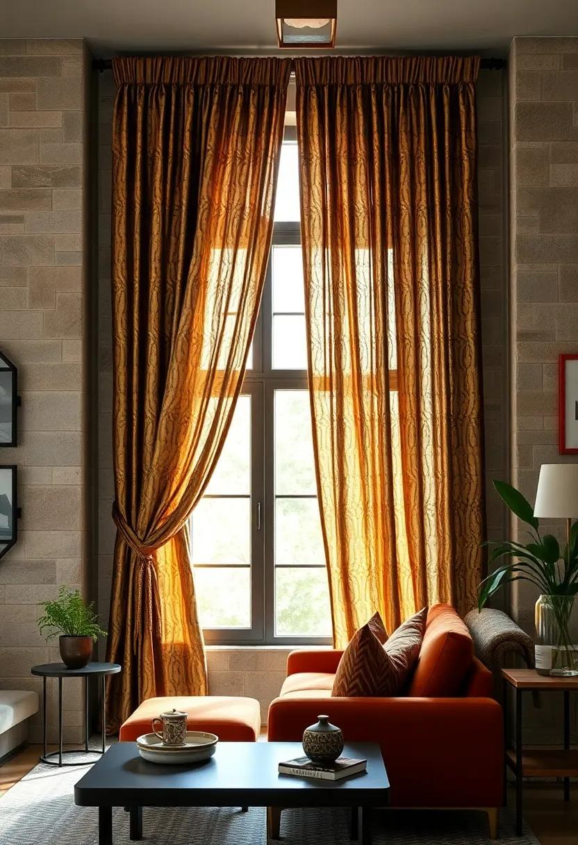 When luxurious brocade curtains cascade gracefully over the raw, unfinished charm of industrial window frames, they create an arresting contrast that elevates the entire space. This juxtaposition not only draws attention but also infuses the room with a rich duality-melding elegance with rugged authenticity. The tactile weight of the brocade, often featuring intricate patterns and shimmering threads, softens the stark metal and distressed wood, inviting a dynamic tension that captivates the eye and enriches the sensory experience of the room.