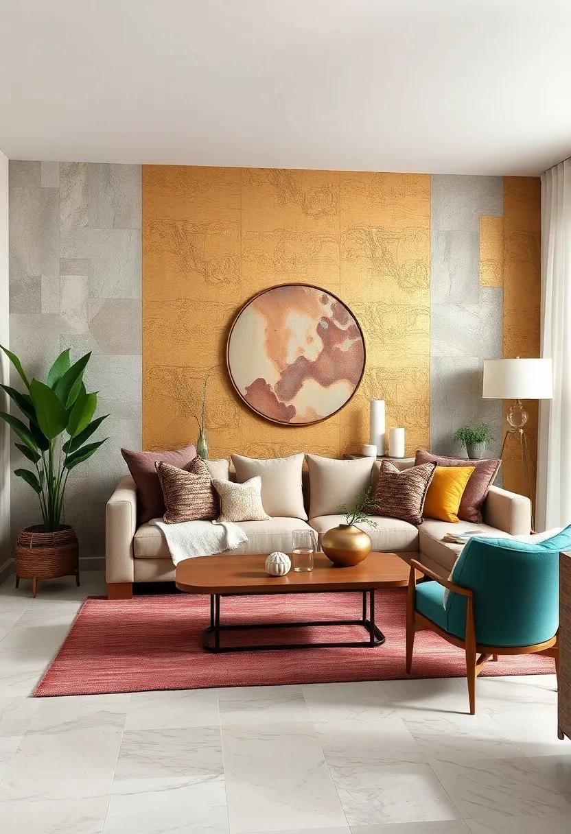 Textured Metallic Wallpaper Adding Glamour to a Room Filled with Soft Earthy Fabrics