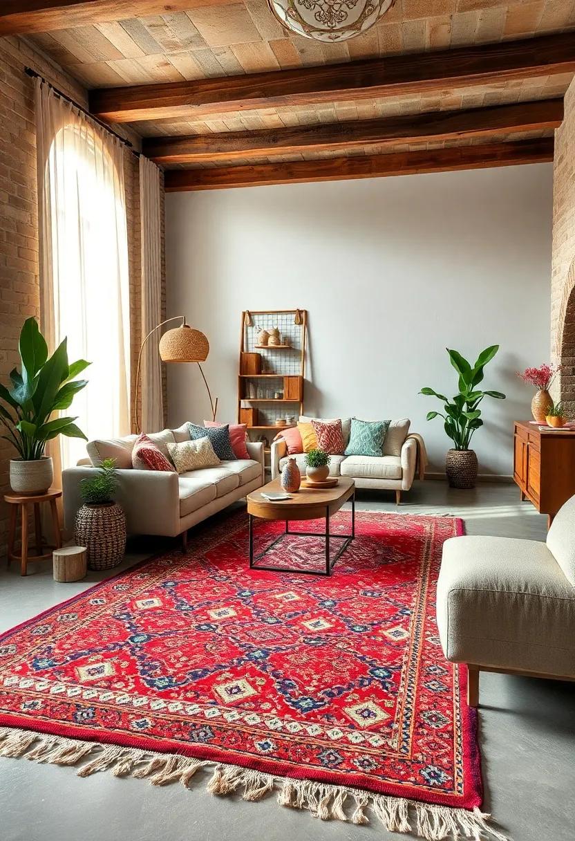 Intricate Moroccan Rugs Layered Over Contemporary Concrete Floors to Add Warmth and Depth