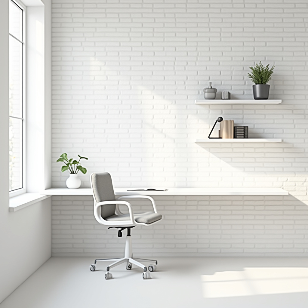 This design features a minimalist floating desk set against a textured white brick wall, creating a modern yet welcoming atmosphere. The desk’s pristine white finish appears to levitate, visually expanding the room while maintaining a clutter-free look.