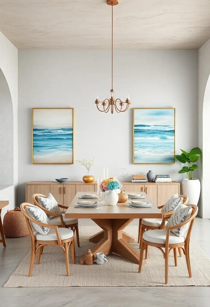 Seascape Paintings Framing the Dining Room Walls with Soft Pastels and Oceanic Hues