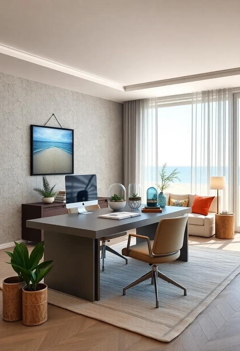 Incorporating subtle coral hues within the decorative accents of a coastal office adds an elegant warmth that effortlessly lifts the space without overwhelming it. These gentle pops of coral, whether through carefully chosen ceramics, soft textiles, or artful knickknacks, invite a feeling of calm vitality reminiscent of sandy shores kissed by dawn’s light. Paired with delicate seashell motifs-think translucent glass ornaments or natural shell clusters-these decorative elements tether the room to the ocean’s quiet luxury, creating an ambiance both inspiring and grounding.