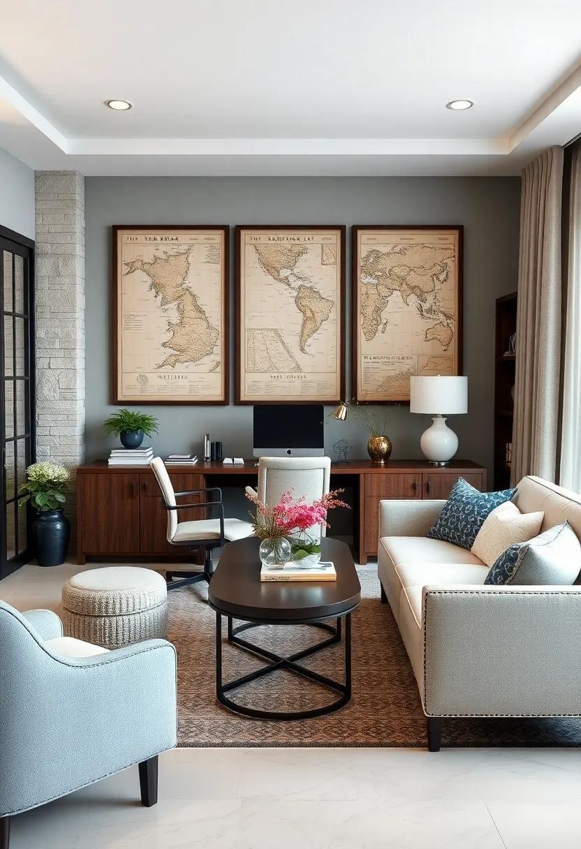 Infusing your office space with a maritime charm becomes effortless when vintage nautical maps take center stage. Encased in rich, dark wooden frames, these timeless pieces serve as both art and conversation starters, evoking memories of oceanic adventures and maritime exploration. The deep wood tones complement coastal color palettes, creating a striking contrast against soft blues and sandy neutrals while adding warmth and depth to the room’s overall ambiance.