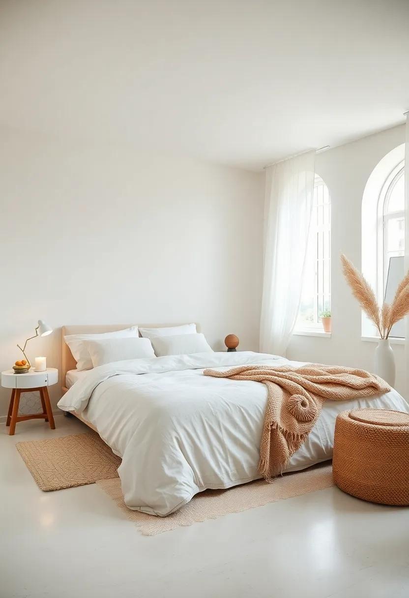 Serene Retreat With All-White Walls, Layered Rugs, and Organic Textures Blending Minimalist Design and Comfort