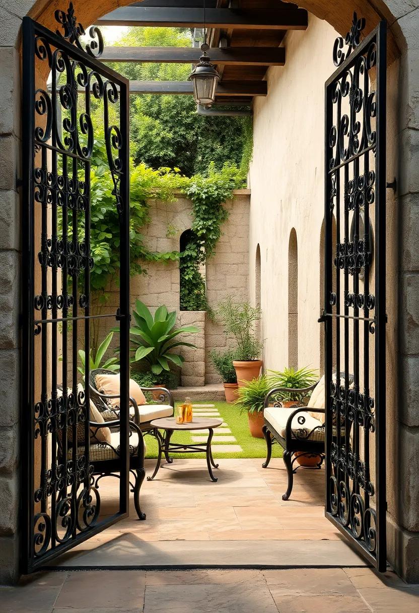 Crafting an inviting outdoor sanctuary begins with a statement piece that seamlessly fuses strength and artistry. The intricate design of wrought iron gates adorned with proud heraldic emblems acts not only as a grand entrance but as a testament to craftsmanship and tradition. These gates evoke a sense of history and nobility, setting the tone for what lies beyond-a refined terrace where elegance is palpable. The delicate patina of aged iron complements the antique urns placed thoughtfully, each vessel a silent storyteller of seasons past and nature’s enduring beauty.