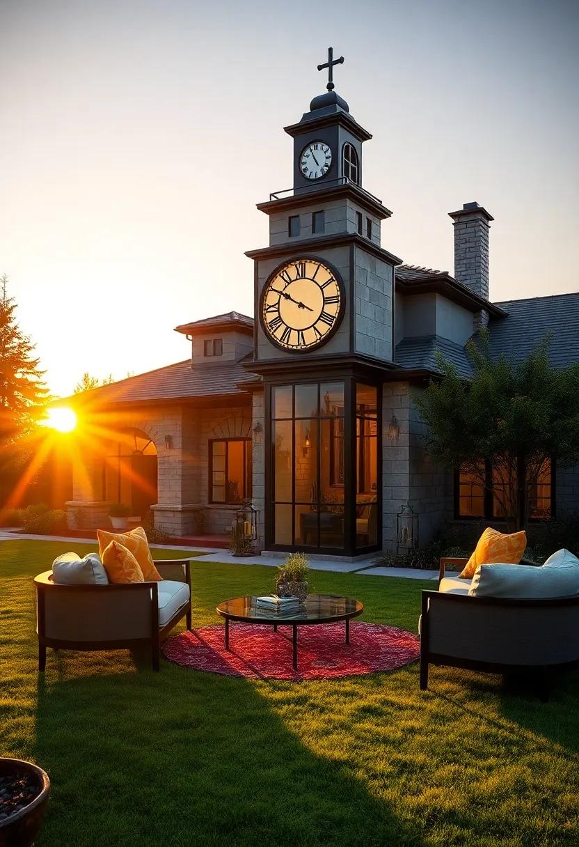 The waning sun casts a golden glow that gently wraps around the antique clock tower, transforming it into an enigmatic silhouette against the twilight sky. As the warm hues blend into the cooling evening, the tower’s intricate ironwork and vintage design emerge not in detail but through striking shadow play. This interplay of light and darkness brings a captivating sense of mystery to the front yard, inviting every observer to pause and admire the timeless artistry standing tall amid the serene landscape.