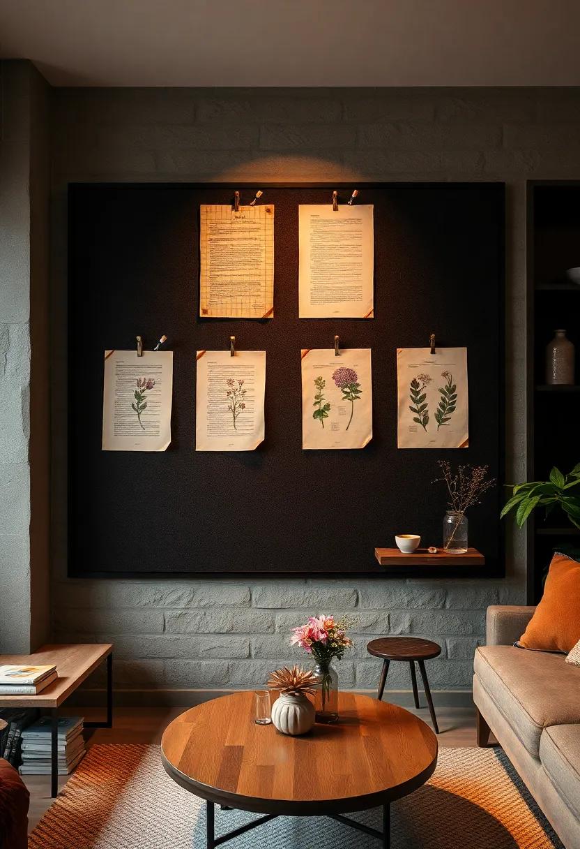 Embracing the charm of vintage academia, arranging old manuscript pages alongside delicate botanical illustrations creates a captivating narrative of knowledge and nature. Pinning these pieces on a dark corkboard not only adds texture but also frames the artwork with a subtle yet striking contrast. The warmth of ambient lighting enhances the aged paper tones, allowing the intricate scripts and botanical details to softly glow, evoking a serene and scholarly atmosphere. This arrangement effortlessly bridges historical textures with natural beauty, making it an ideal focal point for any space seeking a touch of intellectual elegance.