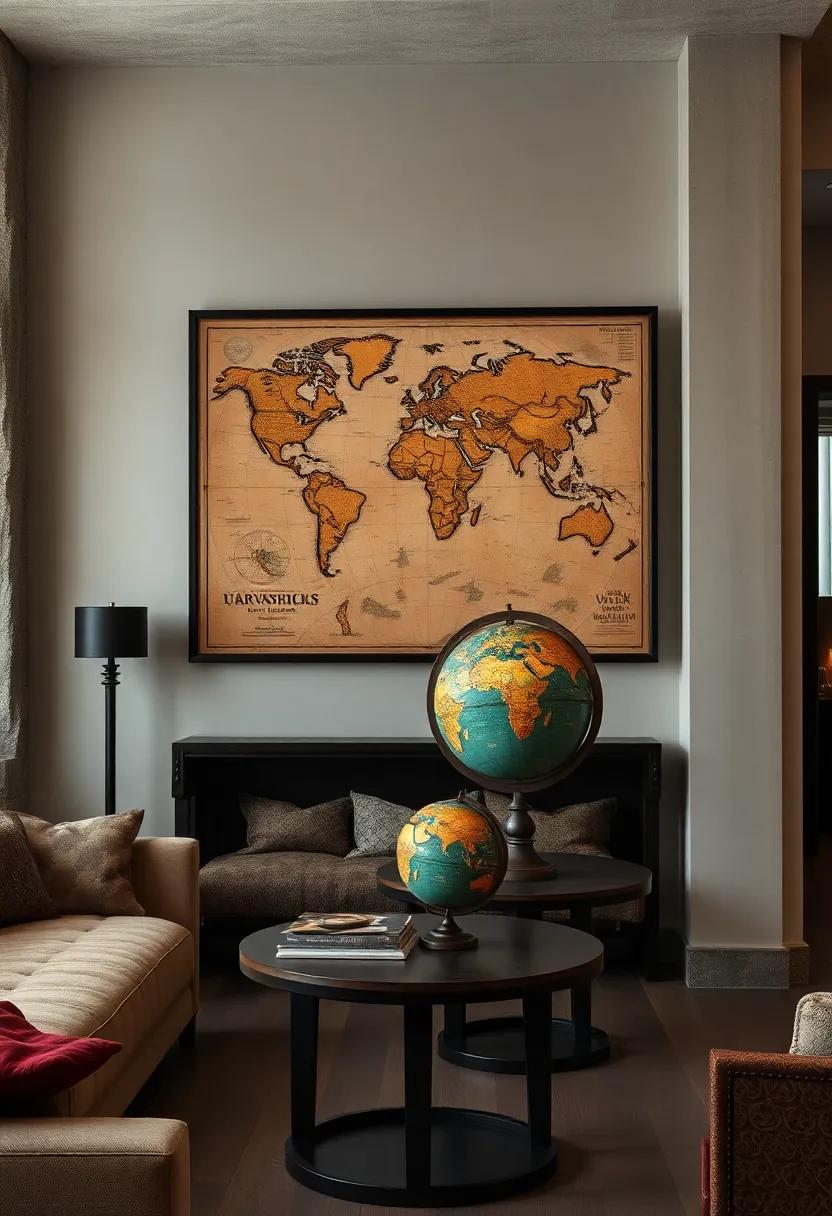 Antique Globes and Baroque Maps Displayed on Darkwood Tables Emphasizing Exploration and Mystery