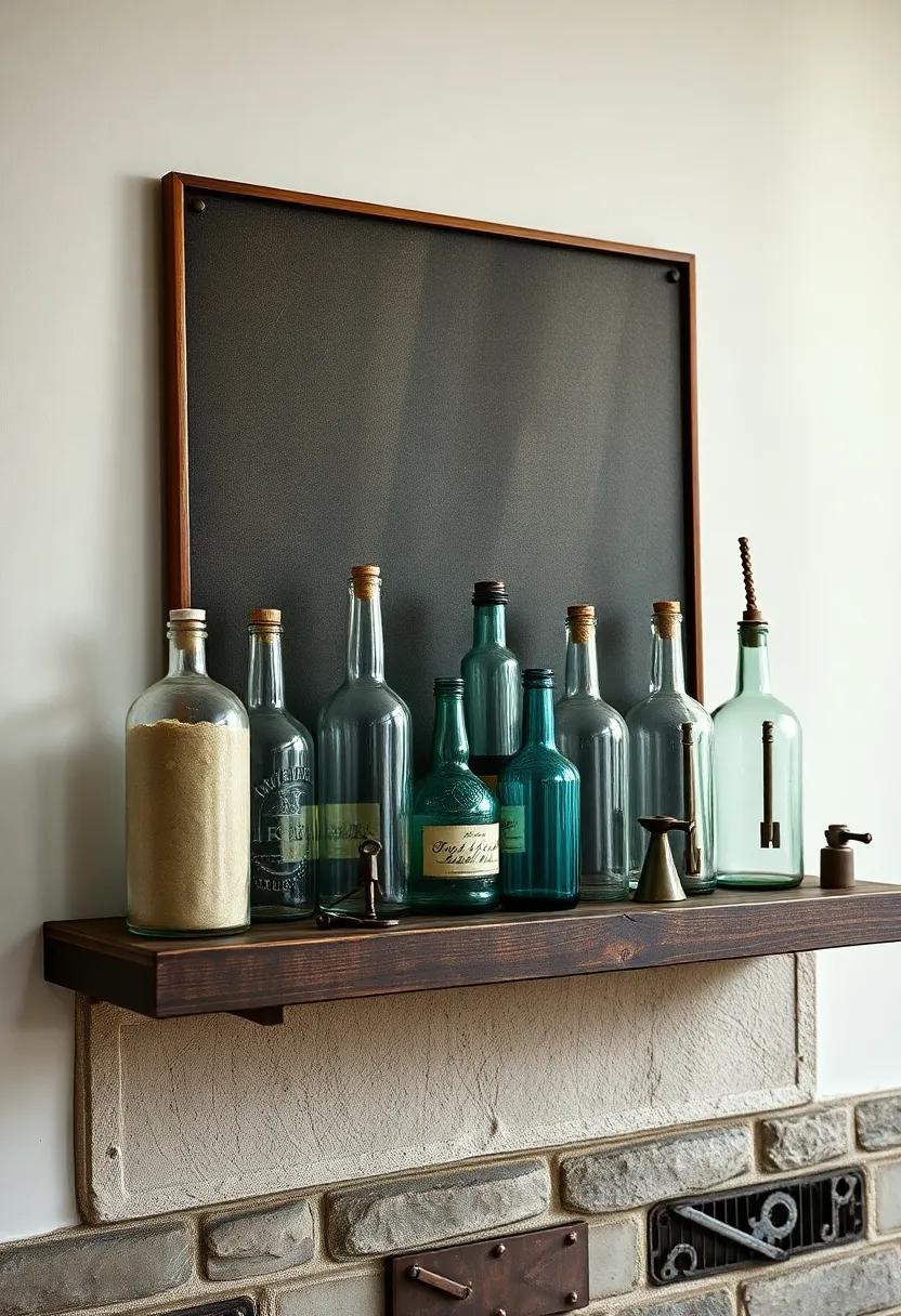 A Collection of Antique Glass Bottles and Vintage Keys Displayed on a Weathered Shelf With Dim Shadows