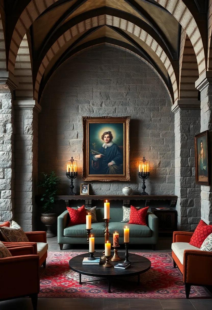 - Distressed wood or wrought iron candle holders with period-inspired motifs to complement the stone texture.