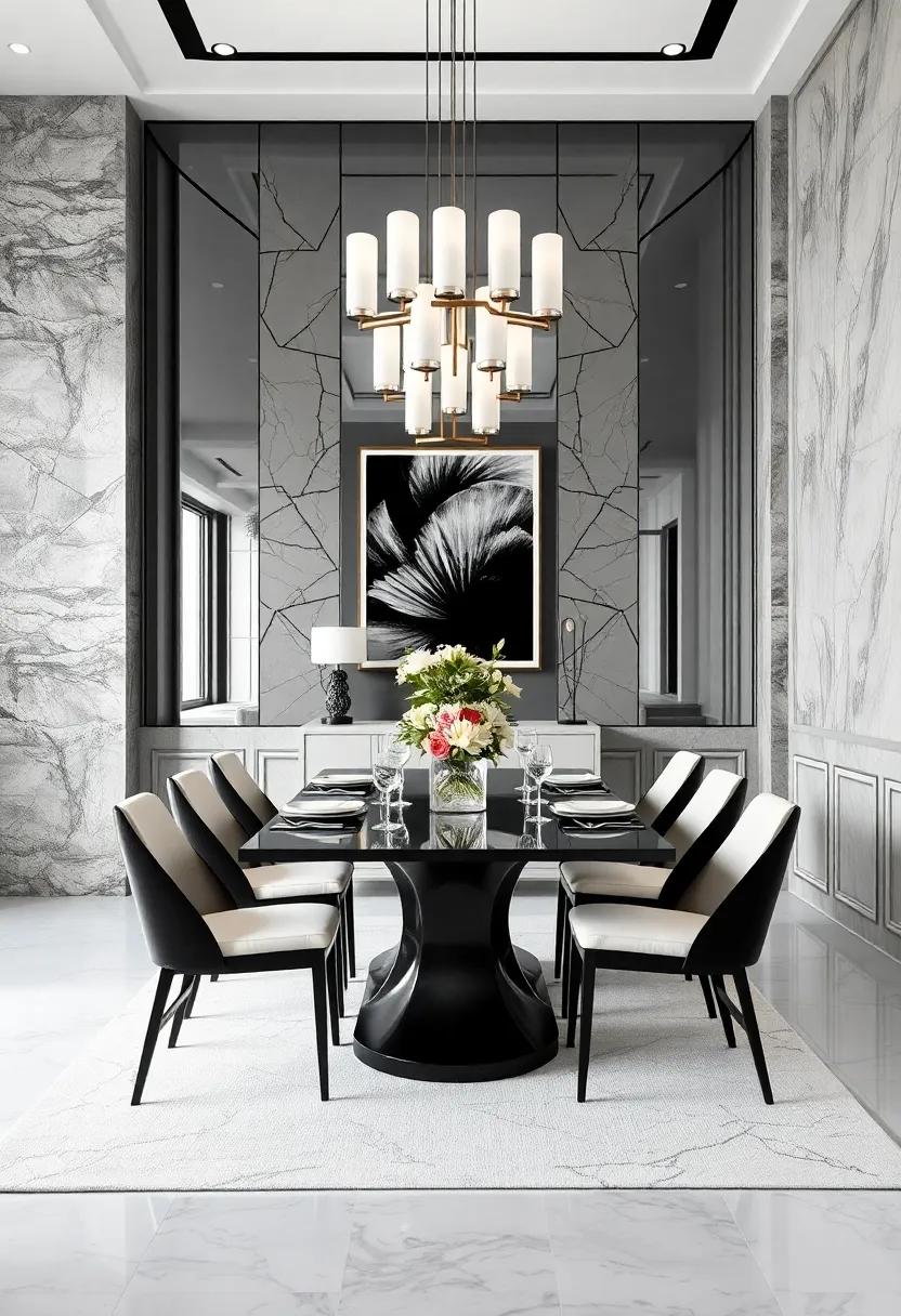 Artistic Black and White Dining Space Incorporating Bold Abstract Wall Murals and Sculptural Centerpieces