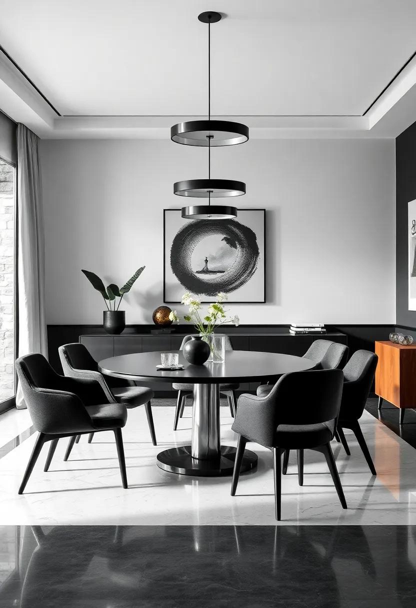 Sophisticated Dining Room Design in Black and White with Strategic Use of Artwork and Sculptural Lighting Elements