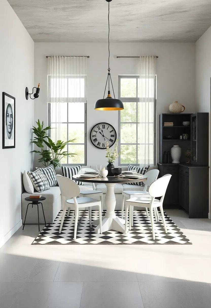Transform a small corner into a charming retreat with a timeless palette that balances boldness and simplicity. The interplay of black and white is elegantly grounded by a classic checkerboard rug, whose geometric pattern injects a playful rhythm underfoot while defining the space visually. Vintage accessories-such as an aged brass candelabra, a weathered mirror with ornate detailing, and delicate porcelain figurines-imbue the nook with storied warmth and personality, turning it into a space that invites long, leisurely meals and intimate conversations.
