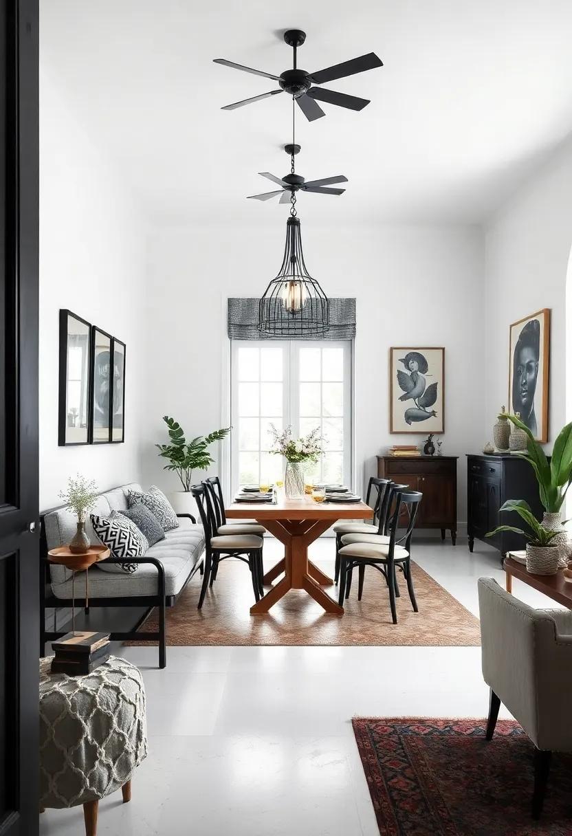 Eclectic Black and White Dining Area Combining Vintage Finds with Modern Art and Statement Lighting Fixtures