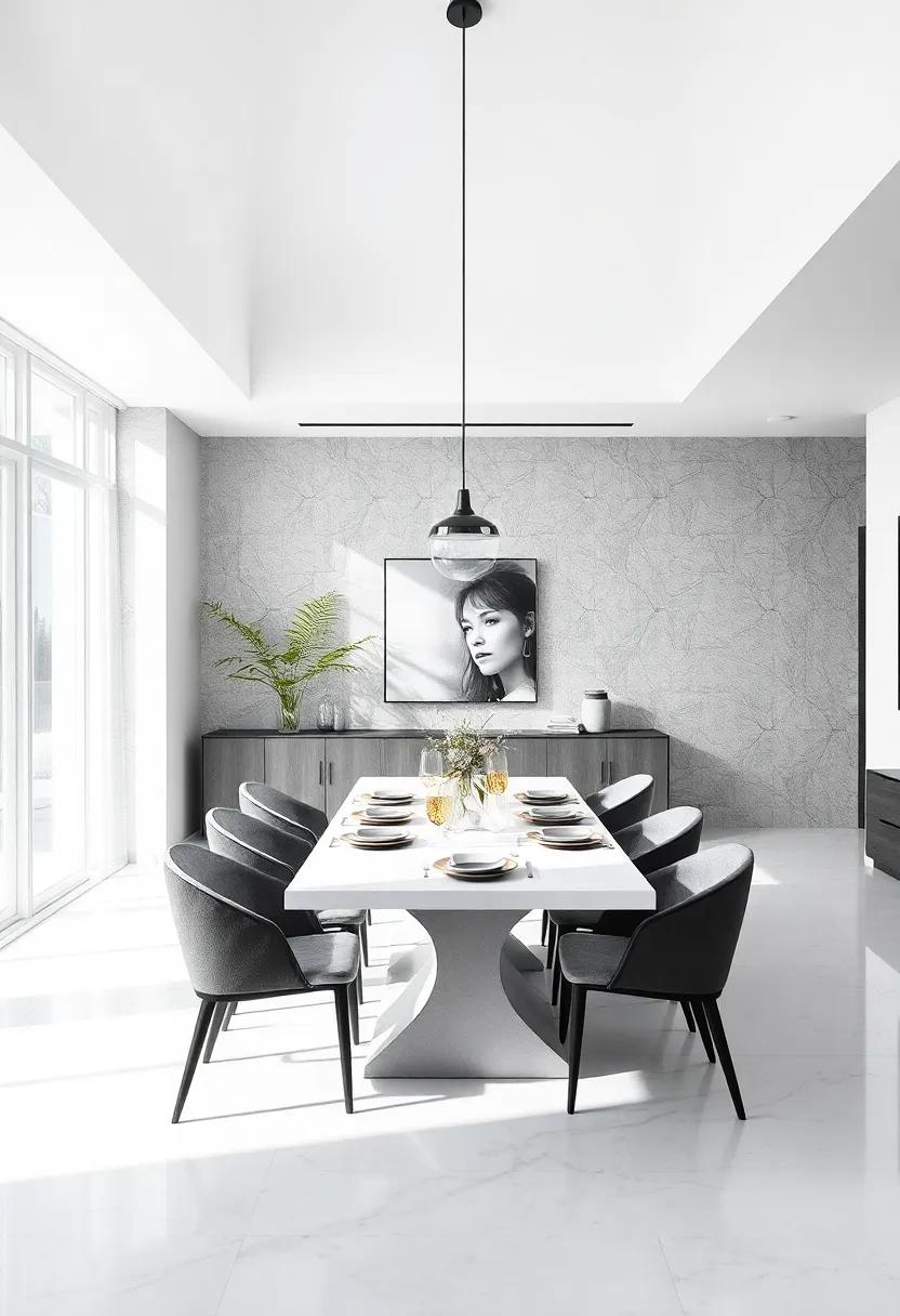 In this captivating dining space, the harmonious blend of vintage furniture pieces with sleek, contemporary accents sets a striking visual dialogue. Imagine an antique wooden dining table paired with minimalist black chairs, each telling a story of past elegance reimagined through a modern lens. The monochrome palette serves as a canvas for bold artistic expressions-large, graphic prints and abstract sculptures breathe life into the walls, adding layers of texture and meaning without overwhelming the refined simplicity.