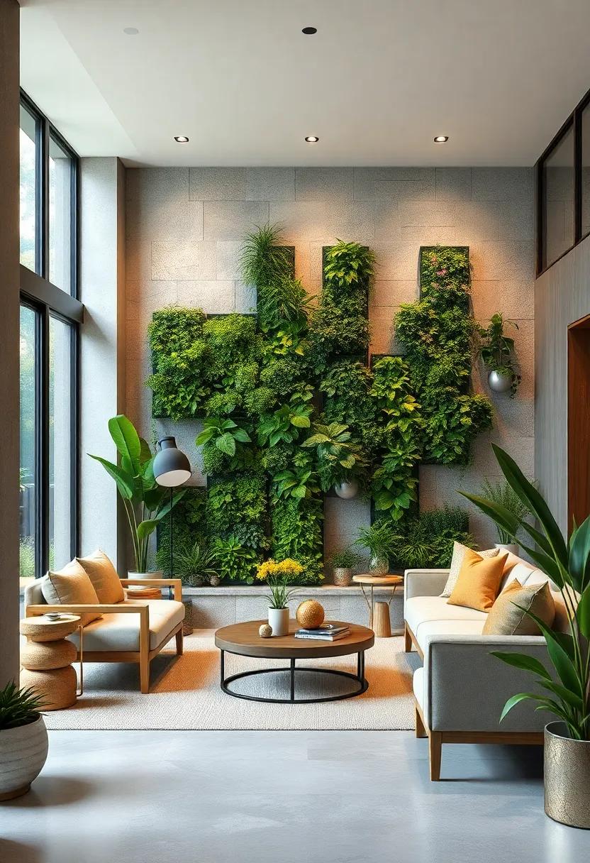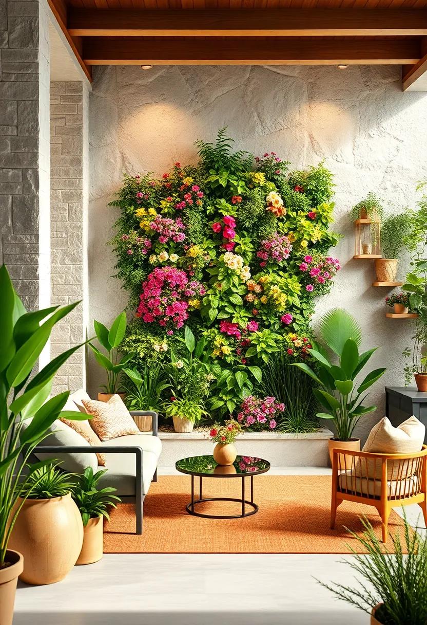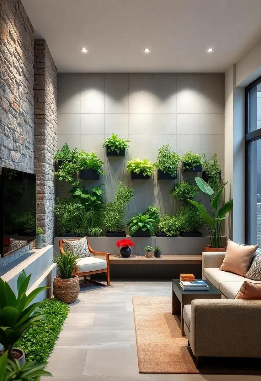 Showcasing Vertical Garden Walls Framed by Stone or Wood Accents for Natural Integration