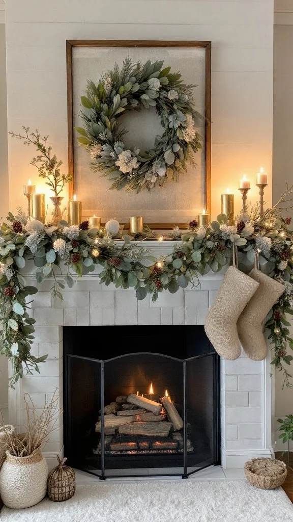 The Elegant Rustic Mantel Display artfully merges the organic charm of natural elements like pinecones, eucalyptus sprigs, and wooden garlands with the refined sparkle of metallic gold and silver candle holders. This harmonious blend of earthy greens and browns with shimmering accents creates a festive yet balanced color scheme. Layering ornaments at varying heights alongside flickering candles adds dimension and a touch of sophistication. This mantel arrangement perfectly fuses rustic warmth with upscale elegance, making it a captivating centerpiece for your holiday gatherings.