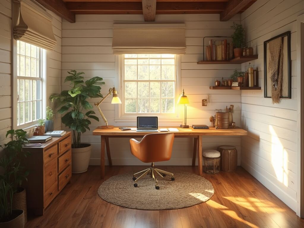 Cozy cabin office illuminated by morning sunlight through an east-facing window, featuring a floating pine desk, leather chair, brass decor, leather-bound books, woven jute rug, walnut flooring, MacBook, and task lamp.