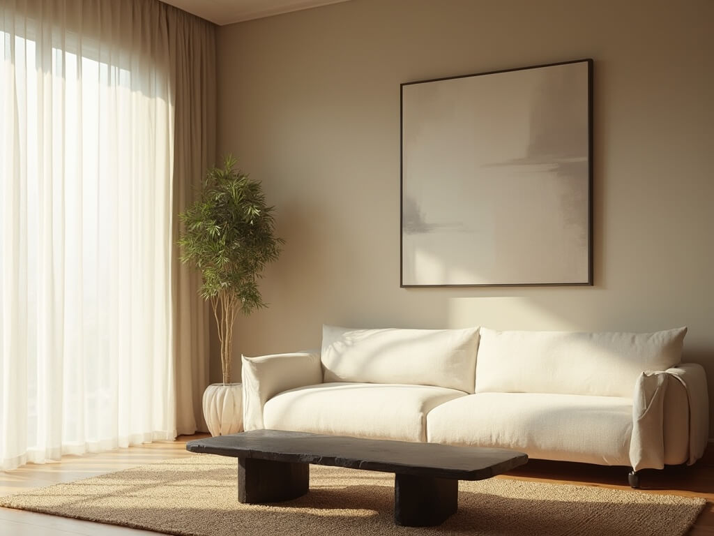 Peaceful living room bathed in morning light with neutral linen curtains, ivory sofa, black stone coffee table on natural jute rug, abstract wall art, and bamboo plant in ceramic pot