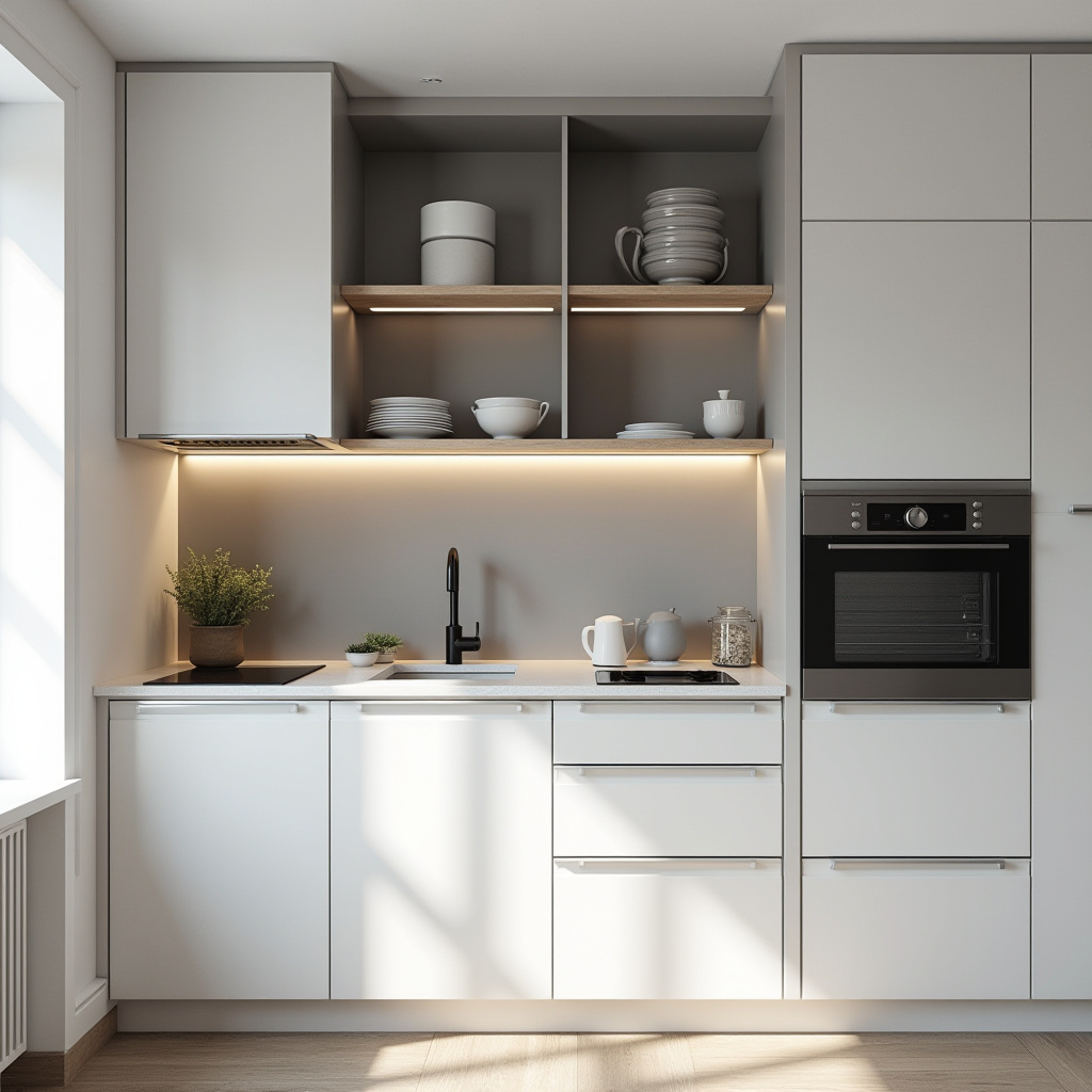 Open shelves illuminated by energy-efficient LED strips serve dual purposes: showcasing select kitchenware and providing easy access to daily essentials. The subtle contrast of soft grey interiors adds depth and lightness, visually expanding the area.