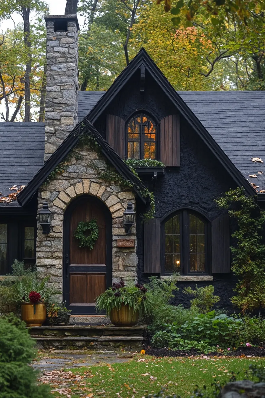Transform your home’s facade into a dark cottagecore haven by embracing moody hues and natural accents. Imagine a charcoal-gray exterior draped with climbing ivy, complemented by weathered wooden shutters and wrought iron details that radiate rustic charm.
