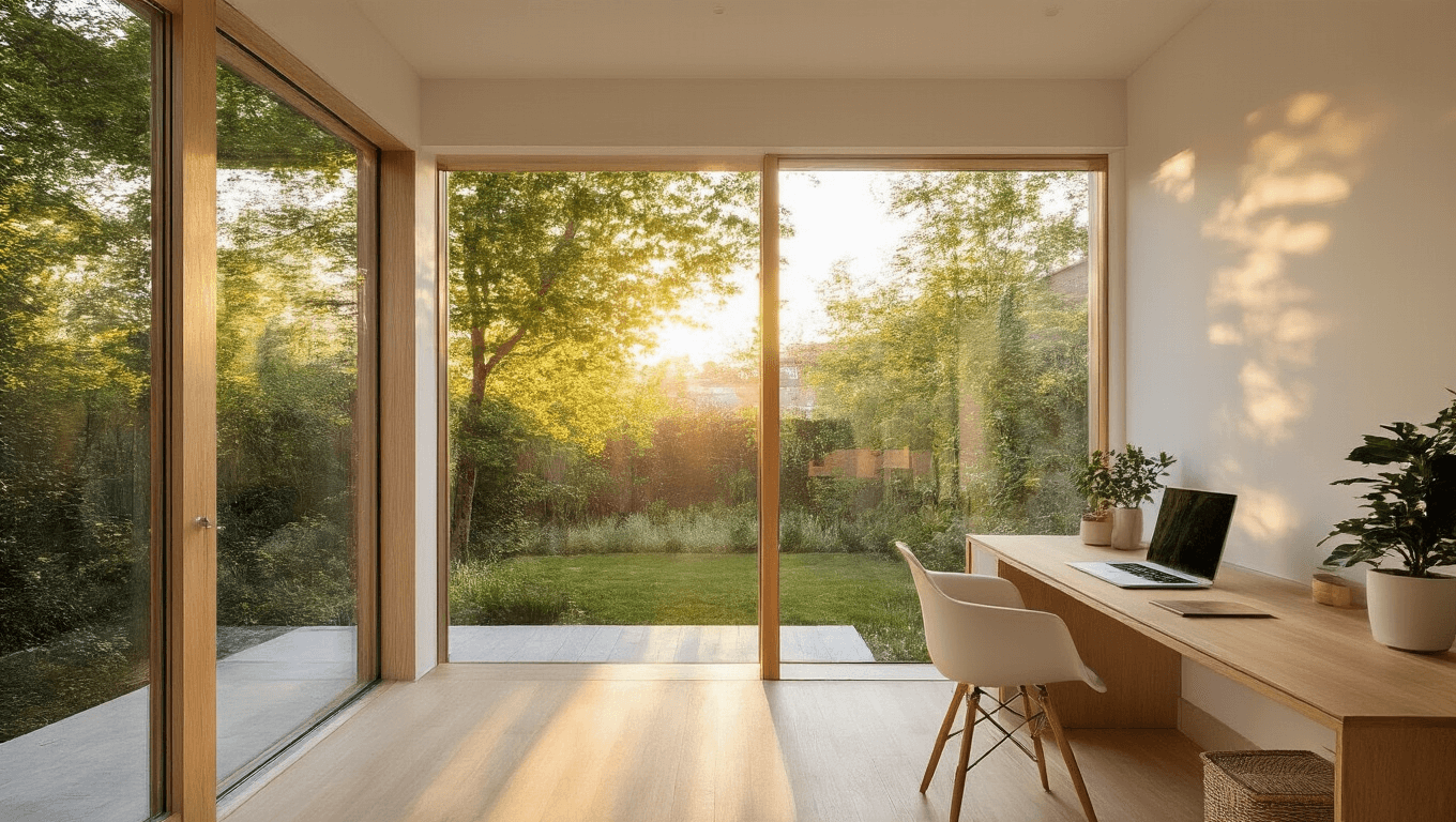 Modern minimalist backyard studio with white oak desk, floor-to-ceiling windows, and warm golden hour lighting.