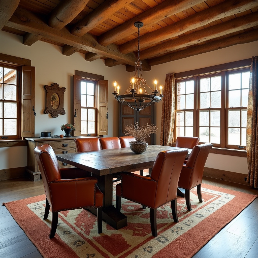 Showcasing masterful craftsmanship, this traditional western dining room features a hand-carved wooden table as its centerpiece. Paired with tooled leather chairs, the space reflects the rich cultural heritage of the West.