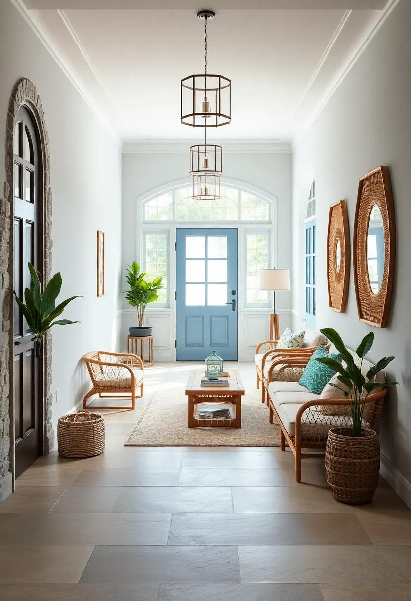 Classic Coastal Entry Designs Featuring Light Rattan Accents and Breezy Blue Hues