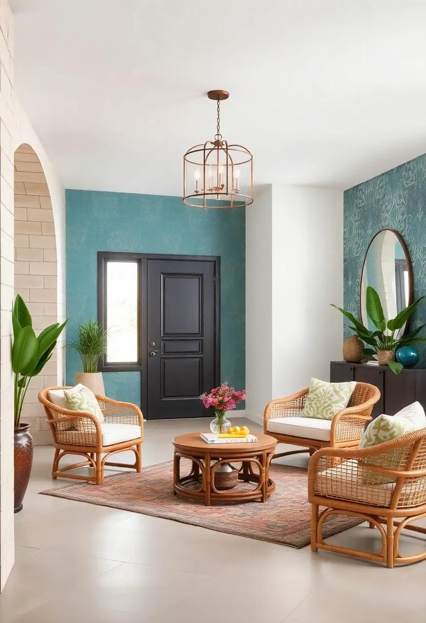 Retro Inspired Entry Spaces Mixing Woven Rattan Furniture with Bold Accent Wall Patterns