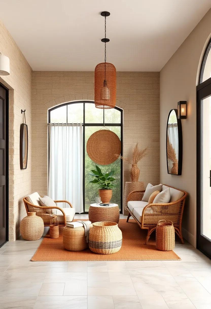 Warm Earth Tone Entryways Enhanced by Layered Rattan Baskets and Soft Fabric Rugs